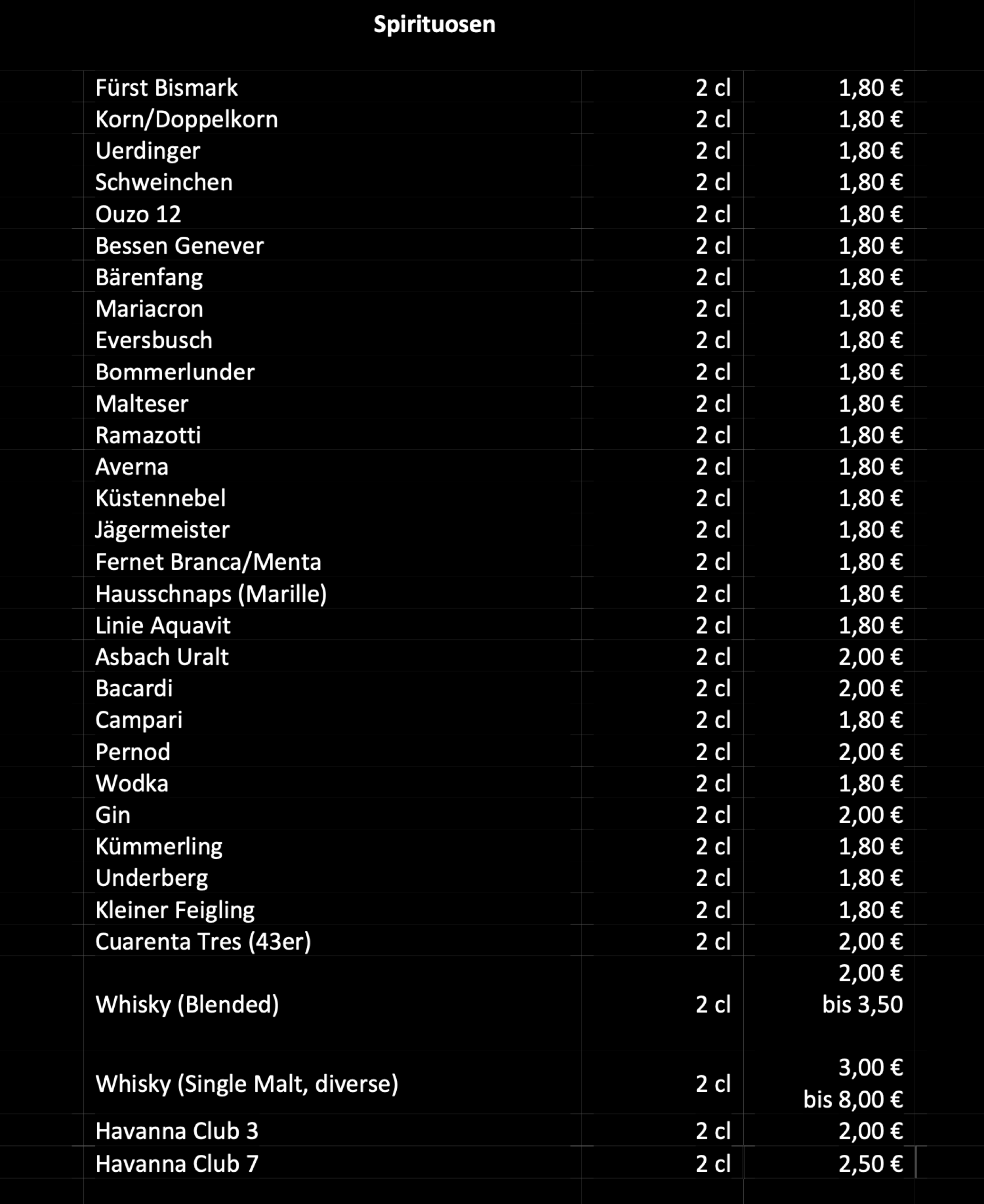 Alle Preise inkulsive Mehrwertsteuer und Bedienung